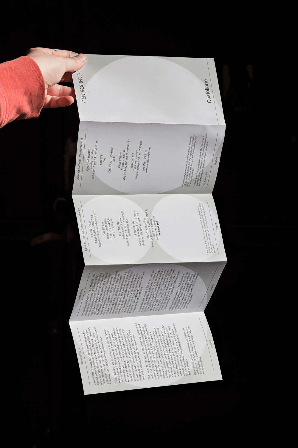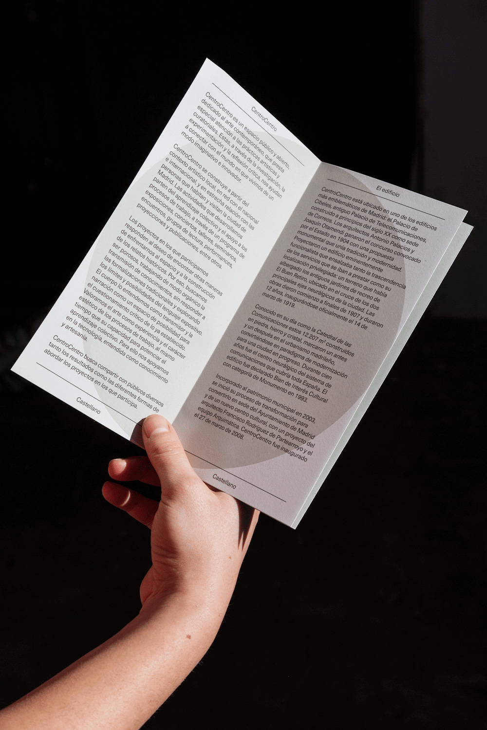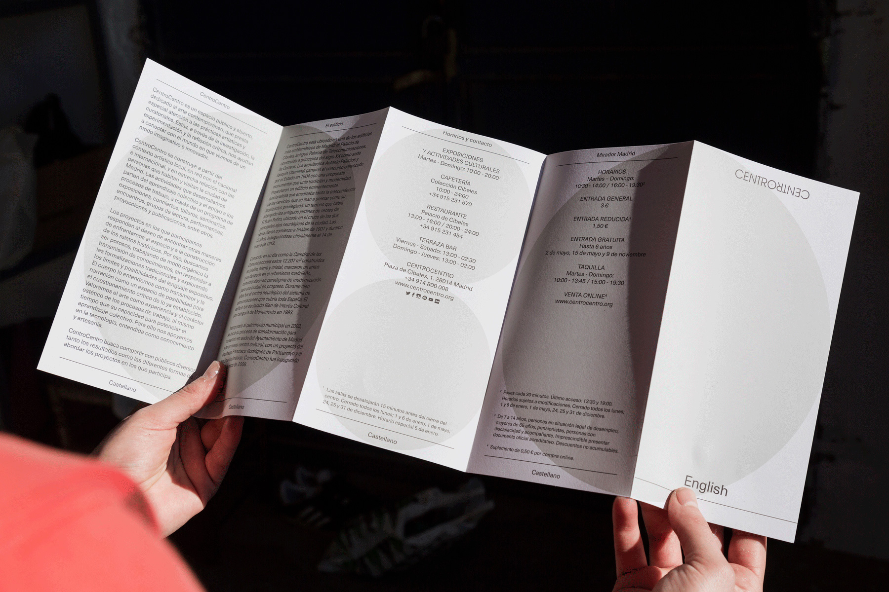 CentroCentro is the official cultural center of the Municipal Government of Madrid, which is dedicated to hosting the culture of all of Madrid’s citizens. It is a public space where leisure and learning take place in a context of participation. Together with Edu Piracés I worked on the redesign of the centre’s communicative materials. We decided to continue using the forms of the circle and the dot that are present in the objectives and location of the building since the building is situated in the centre of the city and functions as a meeting point for urban life and culture. However, we added color to these existing elements to guide the user through the distinct actiities of the centre.