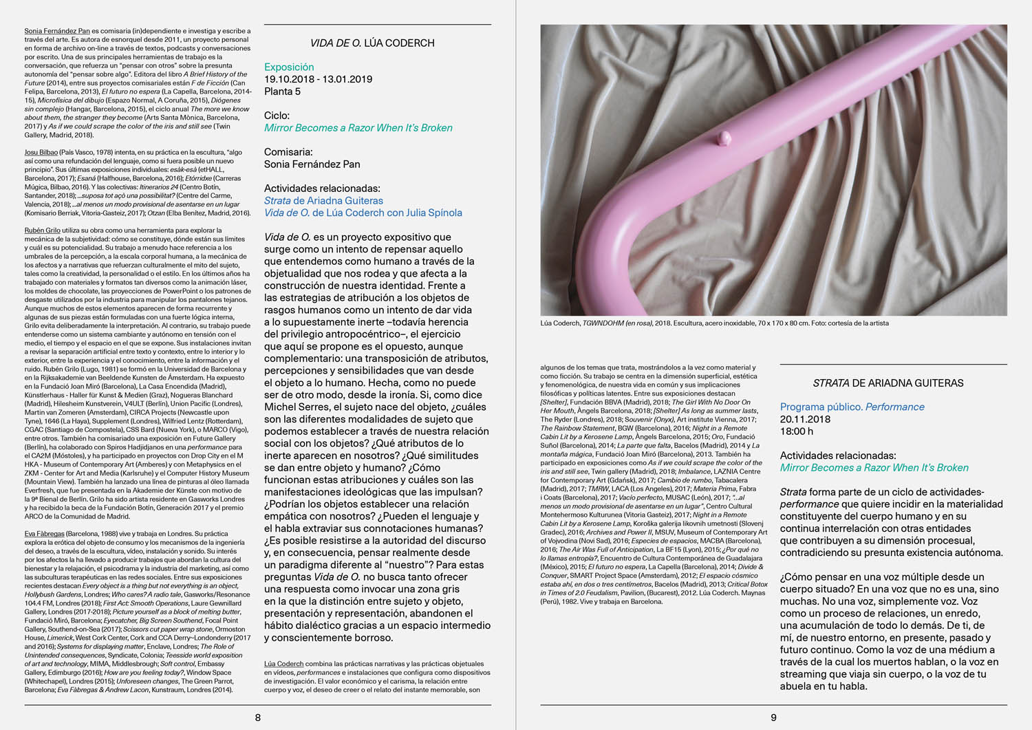 The publication of the exhibition Un Exercici de violència by Guillermo Ros, exhibits and catalogs the working process and the proposal the sculptor made to the museum. Un exerici de violencia at the IVAM´s Gallery 6 simulates two frozen instants, with a different ambience on each of the gallery’s two levels, in which a fight reminiscent of a video game takes place. Un exercici de violència lays bare the violence the artist exposes himself to during the artistic process involved in the very act of exhibiting, which Ros renders here as combat with the architecture of the institution. In the publication, we structure the layout as the museum’s own architecture and columns, where Ros’s combat occurs. A collaboration with Blanca Crovetto. Photography by Alberto Feijóo.