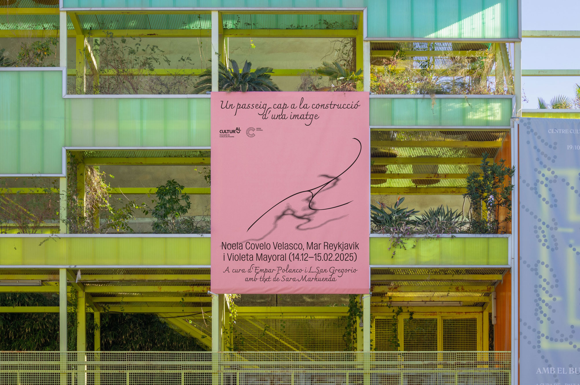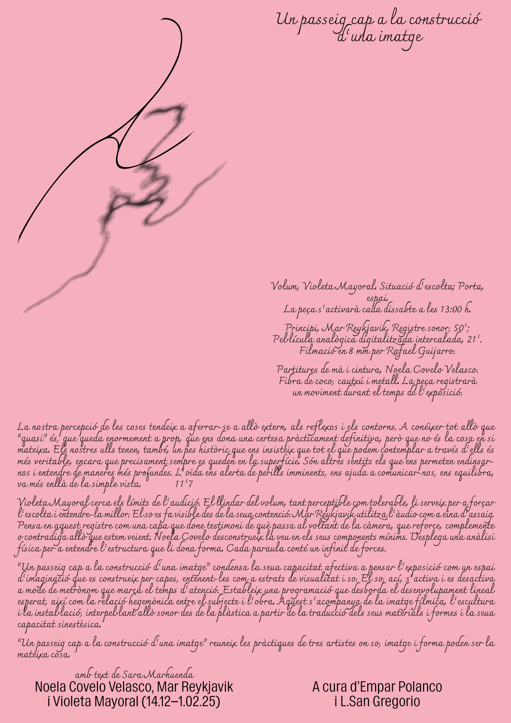 Communication design for the exhibition Un passeig cap a la construcció d'una imatge curated by Empar Polanco and L. San Gregorio at Las Cigarreras, Alacant. The exhibition brings together the practices of Violeta Mayoral, Mar Reykjavik, and Noela Covelo Velasco around the relationship between sound, image, and form, exploring their synesthetic dimension. Collaboration with Ombreta Vokopola.